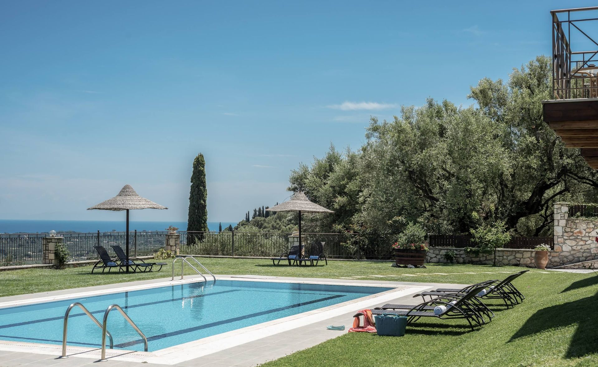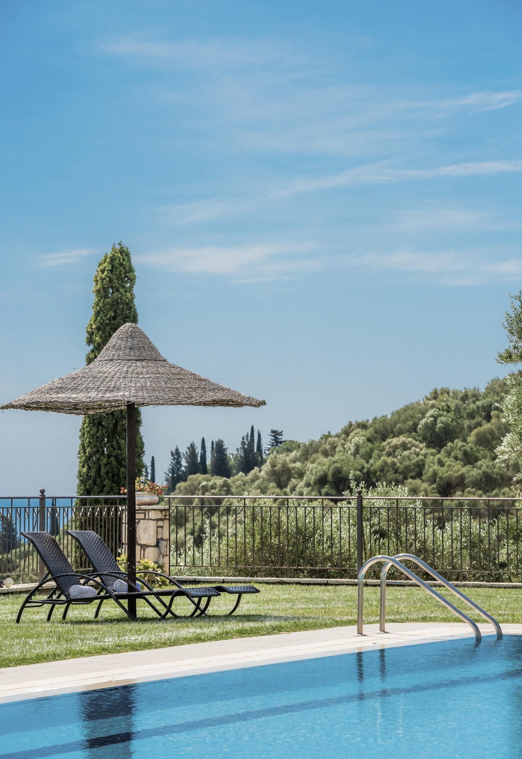 - Zwembad met zonneterras, ligstoelen, parasols en badlakens