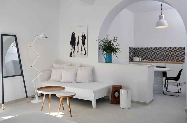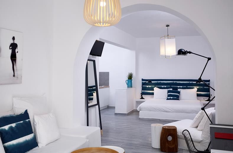 Het hotel ligt direct aan het schitterende vulkanische zwarte strand van Kamari, 5 km van de Santorini nationale luchthaven en 7 km van Fira, de hoofdstad van het eiland Santorini.