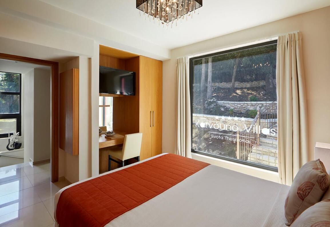 Dit hotel ligt in een prachtige groene baai op slechts 30 m van het strand van Karvouno en 600 m van de haven van Syvota. Syvota is erg populair voor zeilboten en grote privéjachten en biedt de rust van de Ionische Zee, ongeëvenaarde schoonheid, weelderige groene omgevingen, kristalhelder water en natuurlijke aanlegplaatsen. Gasten vinden in Syvota winkels, evenals restaurants, bars en uitgaansgelegenheden. Het oude dorp Vrachonas ligt op ongeveer 8 km en het is ongeveer 24 km naar Igoumenitsa, ongeveer 35 km naar de rivier de Acheron en ongeveer 36 km naar Parga. Dit complex in finca-stijl, gebouwd in 2010, is door ervaren vakmensen van steen gebouwd en omvat in totaal slechts 3 villa's. Ze liggen op een groot perceel, waardoor er voldoende ruimte is voor privacy tussen elke villa. Tot de faciliteiten die dit van airconditioning voorziene etablissement te bieden heeft, behoren een lobby, een wisselkantoor, een café, een restaurant en draadloos internet. De villa's combineren moderne en traditionele stijlen. Elke villa is uniek en is prachtig ingericht en smaakvol ingericht met een tv-lounge/zitkamer, een marmeren badkamer en een volledig uitgeruste keuken. De badkamer is voorzien van een douche/bad en een haardroger en de slaapkamer heeft een tweepersoonsbed. De villa's zijn uitgerust met een telefoon met directe buitenlijn, satelliet-/kabeltelevisie, een hifi-installatie, internettoegang en een kluisje. Er is een keuken met een minibar, een koelkast, een fornuis, een magnetron en koffie- en theefaciliteiten. Verder zijn er standaard een wasmachine, een strijkijzer en -plank, centrale verwarming en airconditioning in alle accommodaties aanwezig en hebben ze allemaal een balkon of een terras.