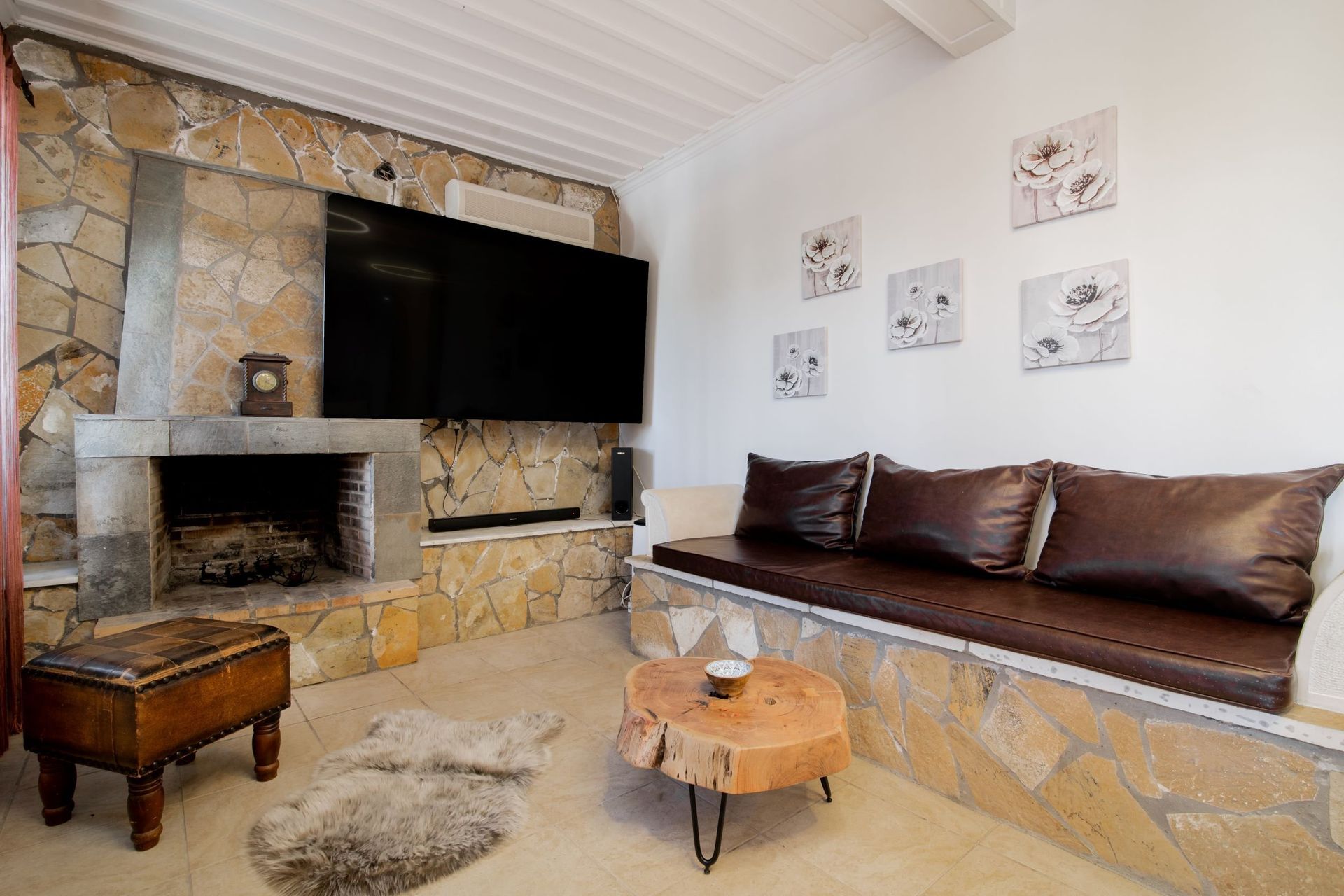 Woonkamer met slaapbank, openhaard en zithoek