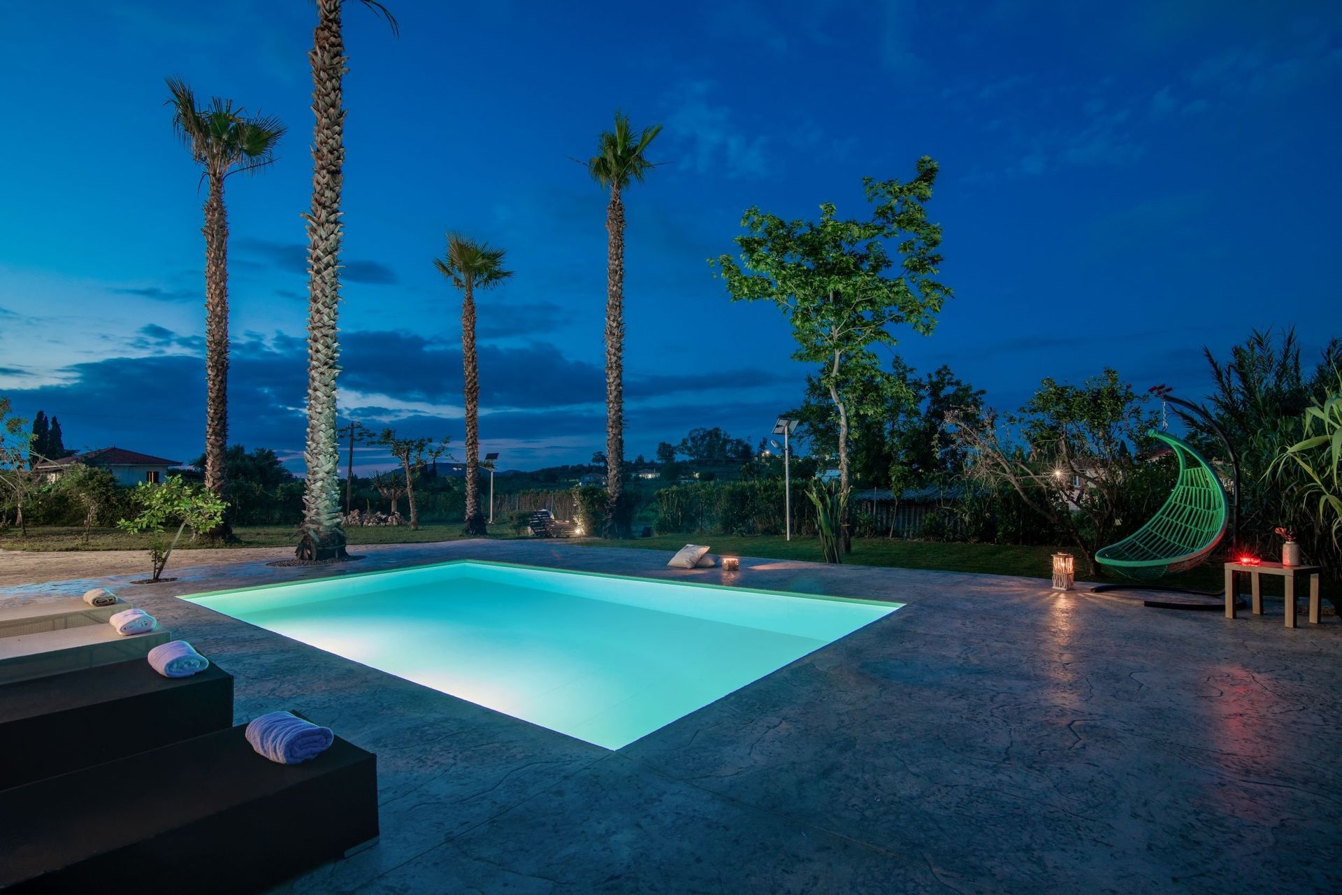 Zwembad met ligbedden, parasols en badhanddoeken