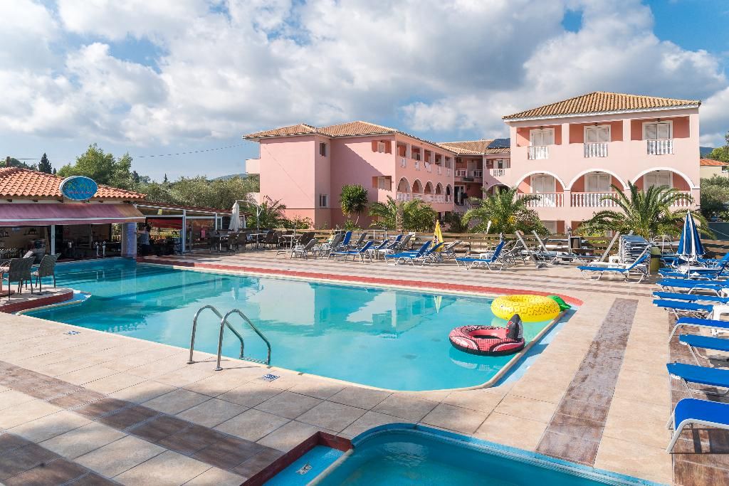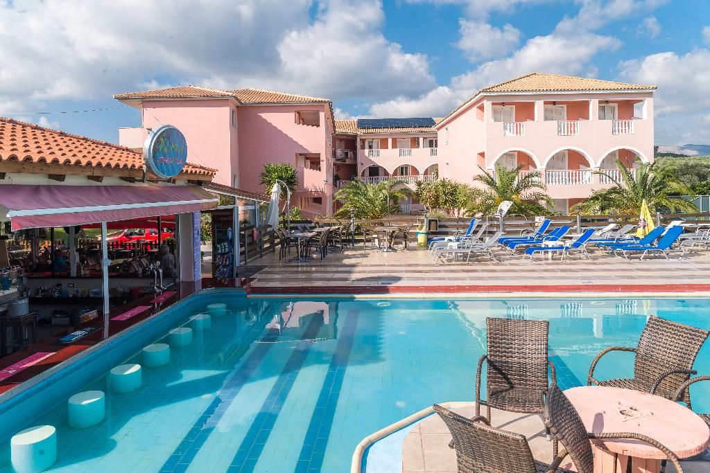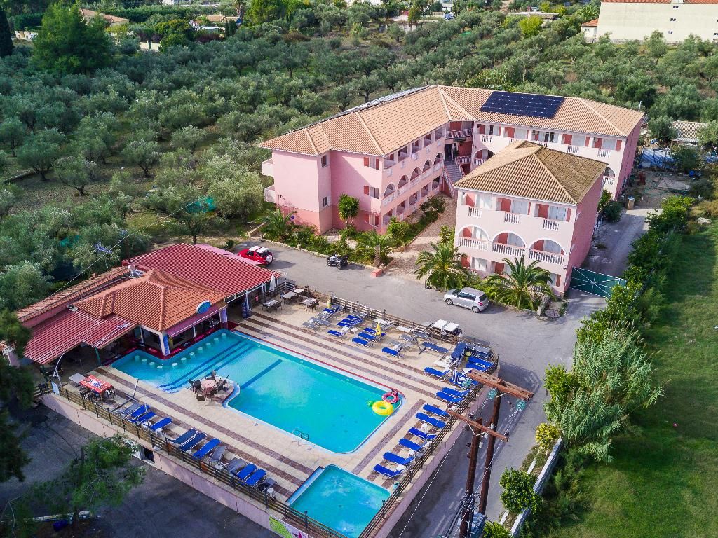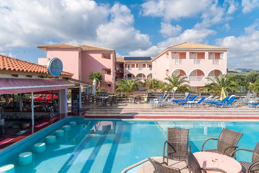 Dit prachtige etablissement ligt op ongeveer 100 meter van de hoofdweg in Laganas. Het is gelegen in het resortcentrum en op ongeveer 800 meter van het belangrijkste strand, een van de langste stukken aan de zuidkust van het eiland. Dit complex bestaat uit 7 blokken ruime appartementen en er is een groot zwembad in vrije vorm met de enige Swim-up poolbar in Zante. De snackbar aan het zwembad is de hele dag open en biedt een breed scala aan maaltijden en een levendig entertainmentprogramma voor iedereen. De goed gevulde bar biedt karaoke-avonden en zwembadwedstrijden, evenals een verscheidenheid aan feestavonden voor gasten van alle leeftijden. Een volledig uitgeruste sportschool is ook beschikbaar naast het hotel, een benzinestation, een autoverhuur- en fietsverhuur en de grootste supermarkt in Laganas bevindt zich tegenover het hotel.